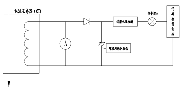 當(dāng)電流互感器因故障開路時,指示燈亮,可控硅導(dǎo)通(6A)保護(hù)電流互感器。